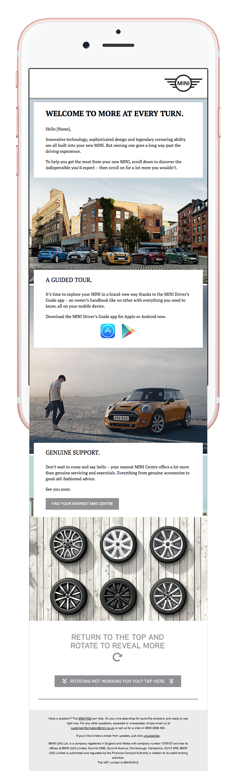 In portrait, new drivers were introduced to the supportive, indispensable tips they would anticipate from a brand like MINI. But turned landscape, a whole new world of MINI perks was uncovered, showing new drivers the MINI club they joined was just as surprising as they'd hoped for.